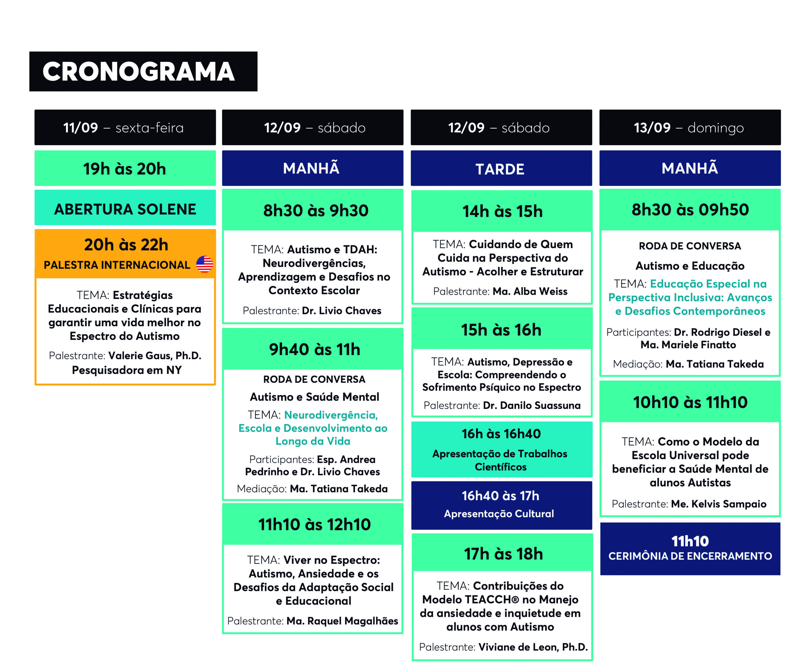 Em sua oitava edição, o evento traz como tema central “Transtorno do Espectro Autista e Saúde Mental: como a saúde mental impacta a inclusão escolar”, reunindo as pesquisas científicas mais recentes sobre o tema. Contaremos com a participação de especialistas renomados na área, além de autistas que contribuirão com seus relatos e vivências nas rodas de conversa, enriquecendo o debate com perspectivas fundamentais.